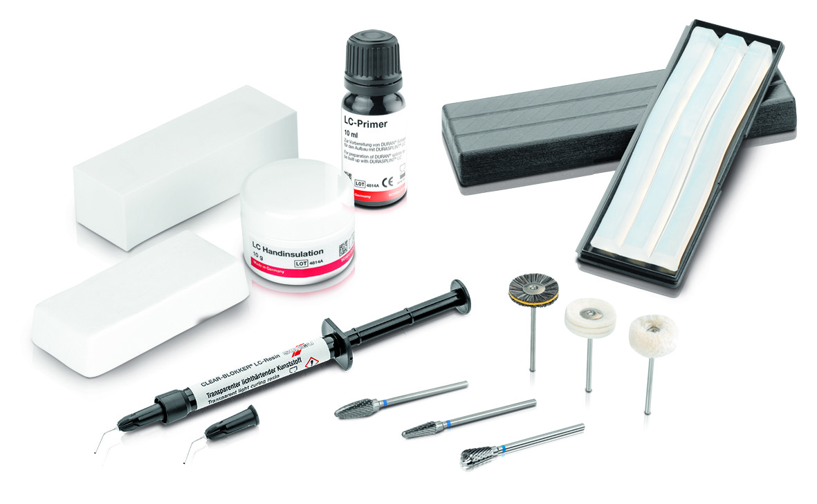 Kit comes with 3 bars of 38 g DURASPLINT LC, 1.5 g CLEAR-BLOKKER with 2 mini cannula, 10 ml LC-Primer with brush, 10 g LC-Insulation, 1 LC-Bur A, B and C, 1 SD-Polishing Paste A and B, 5 SD-Polishing Brushes, 5 SD-Felt Wheels and 5 SD-High-Gloss Polishing Mops with mandrel