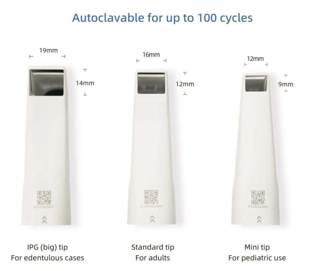 Versatile Scanning Tips: Three different sized tips for various needs: an IPG tip for edentulous cases, a standard tip for general use, and a mini tip for pediatric patients. These tips are durable, able to withstand up to 100 sterilization cycles.